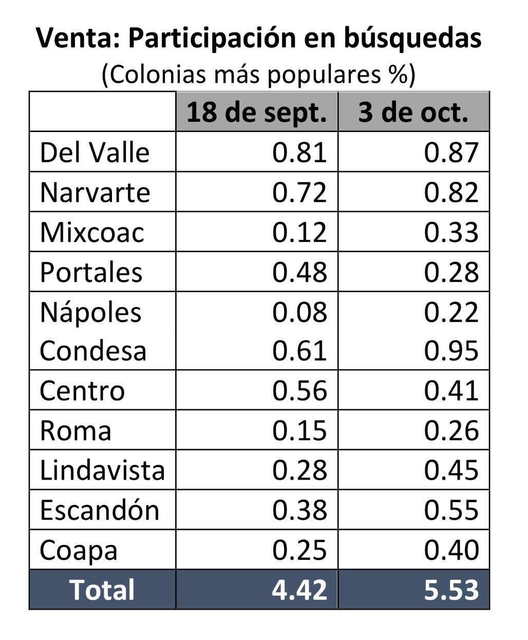 Pero si el interés por la compra aumentó, el de la renta lo hizo mucho más. Diez colonias, en cuatro delegaciones, aumentaron su participación en el total de búsquedas, de 4% al 9%. Esto revela que el temor generado por el sismo no redujo el interés por las viviendas en las delegaciones más afectadas. Las búsquedas revelan también algo interesante, es el cambio en la percepción en torno a la renta, algo que podría ser clave para el desarrollo de este mercado en los próximos años.