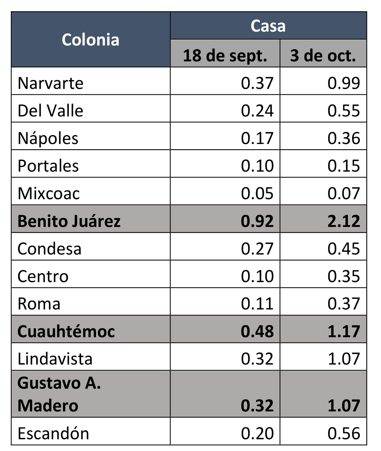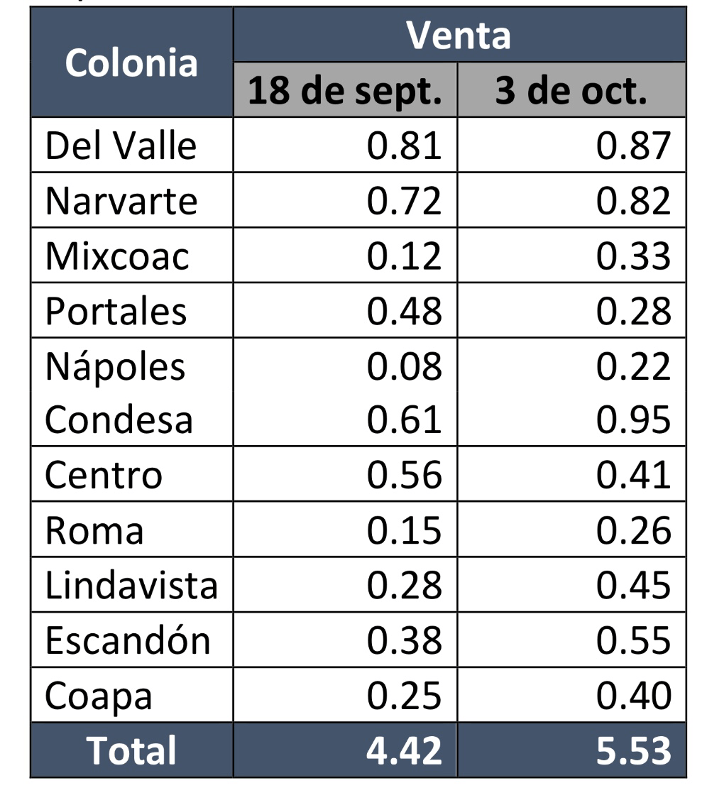 A nivel de zonas se aprecian mayores diferencias. Por ejemplo, en Coapa, parte de la delegación Coyoacán y donde se registraron algunos daños importantes, los precios de las departamentos en venta se mantuvieron prácticamente iguales, al igual que en la Condesa y en la Roma. Por otro lado, los incrementos más notorios se dieron en colonias cercanas a los siniestros como Escandón (3.5%) y Portales (1%).