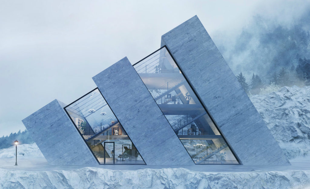 - Trihouse: Este diseño es de 560m² con tres bloques de hormigón en diagonal y dos de cristal. Y puede reconocerse fácilmente el logo de Adidas.