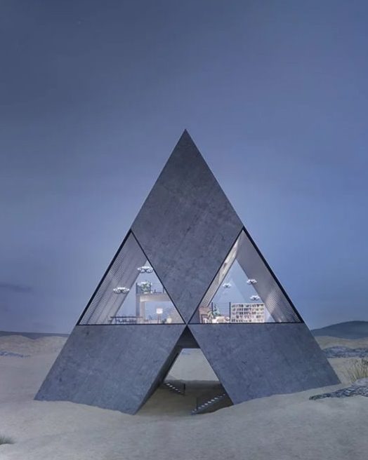 4. Pyrahouse: En estos diseños no podía faltar una pirámide. En esta casa de 320m², la habitación se encuentra en la planta superior. El logo al que hace referencia esta casa es el de Mitsubishi.
